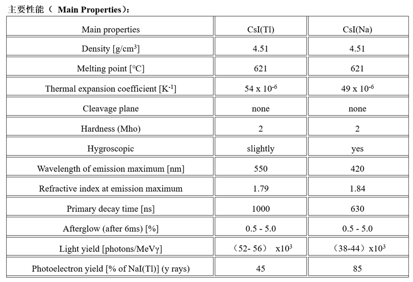 CsI(Tl)晶体的光输出为碘化钠晶体的45%,发光主峰位在550nm,能与硅光电二极管很好地匹配,从而使读出系统大为简化。它的衰减时间与入射粒子的电离本领有关,特别适宜于在强γ本底下探测重带电粒子。CsI(Tl)晶体较软且有一定的可塑性,可以制成各种形状,能承受较大的机械和热冲击。在空气中使用时与碘化钠相比,轻微潮解。 CsI(Na)的发光效率与NaI 接近,发射光谱的主峰位在420nm,更容易与光电倍增管配合,温度效应好,适合于在高温环境和空间科学研究中使用。它的缺点是在低能(20keV)下发光效率很快下降,潮解作用比CsI(Tl)严重。 ![]() | |||||||||||||||||||